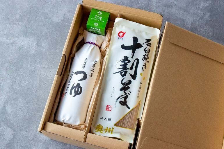 佐々長醸造の希釈用つゆと、石臼挽きそば粉100%使用の十割そばに、そばとぜひ一緒に味わっていただきたい生七味をセットにした、IWATE STAR BRAND厳選のギフトセットです。